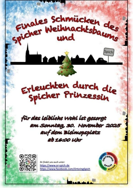 Am Sonntag, den 30.11.2025 ist wie jedes Jahr vom Ortsring organisiert, das traditionelle Erleuchten des Spicher Weihnachtsbaums auf dem Bleimopsplatz. [...]