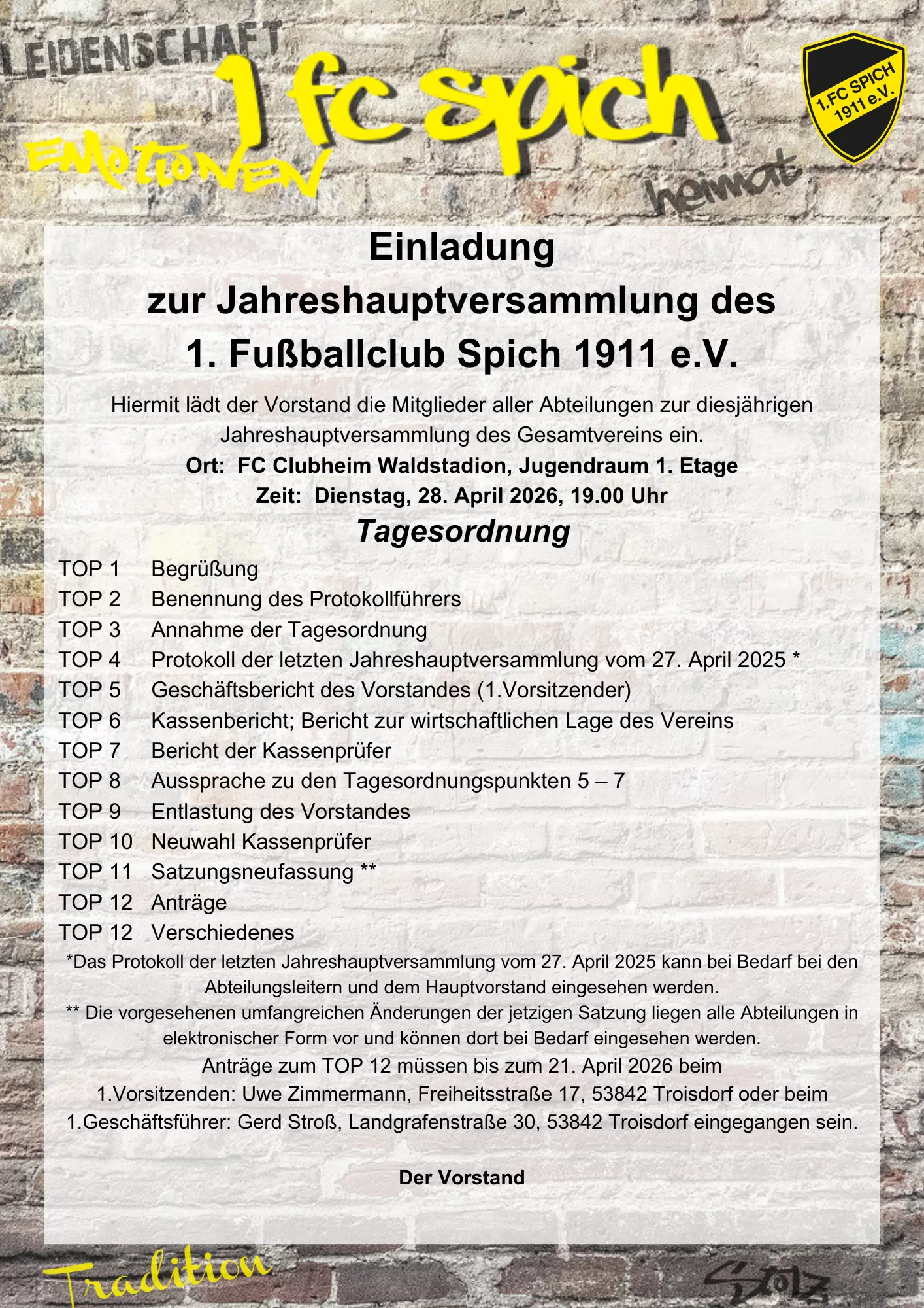 Der Vorstand des 1. FC Spich 1911 e.V. lädt alle Mitglieder herzlich zur diesjährigen Jahreshauptversammlung des Gesamtvereins ein. 📅 Datum: [...]