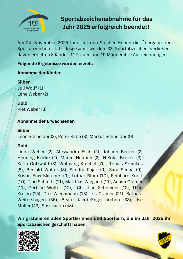 Am 24. November 2025 fand auf den Spicher Höhen eine Veranstaltung zur Übergabe der Sportabzeichen statt. Insgesamt konnten 33 Teilnehmerinnen und Teilnehmer für ihre sportlichen Leistungen ausgezeichnet werden. Die Verleihung würdigte das Engagement und die Ausdauer der Sportlerinnen und Sportler, die dieses Jahr erfolgreich die Anforderungen für das Sportabzeichen erfüllt hatten.