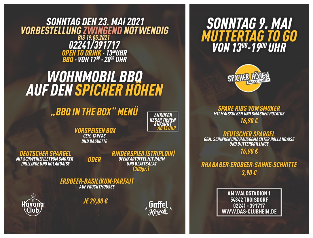 MUTTERTAG | SPICHER HÖHEN | DAS CLUBHAUS | UND AUSSICHT Von Markus Braun|2025-07-17T11:04:14+02:0008.05.2021|ENTWÜRFE| Zeige grösseres Bild Anbei die aktuellen Angebote von unserem Clubhaus!